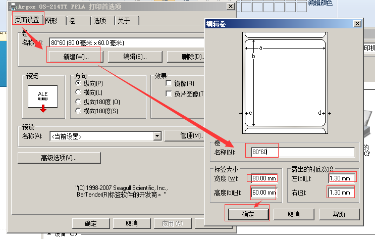 WIN7系统-开始-设备和打印机-找到Argox OS-214TT PPLA这个打印机图标右键-选择“打印机首选项”-点击“页面设置”-卷名称点“新增”-宽高分别设置80mm 和60mm 左右边距都设置1.3mm即可
